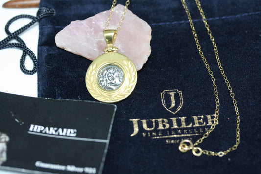 Alexander III The Great Gilt Silver Coin Pendant 20" 14K 585 Gold Rolo Women's Necklace